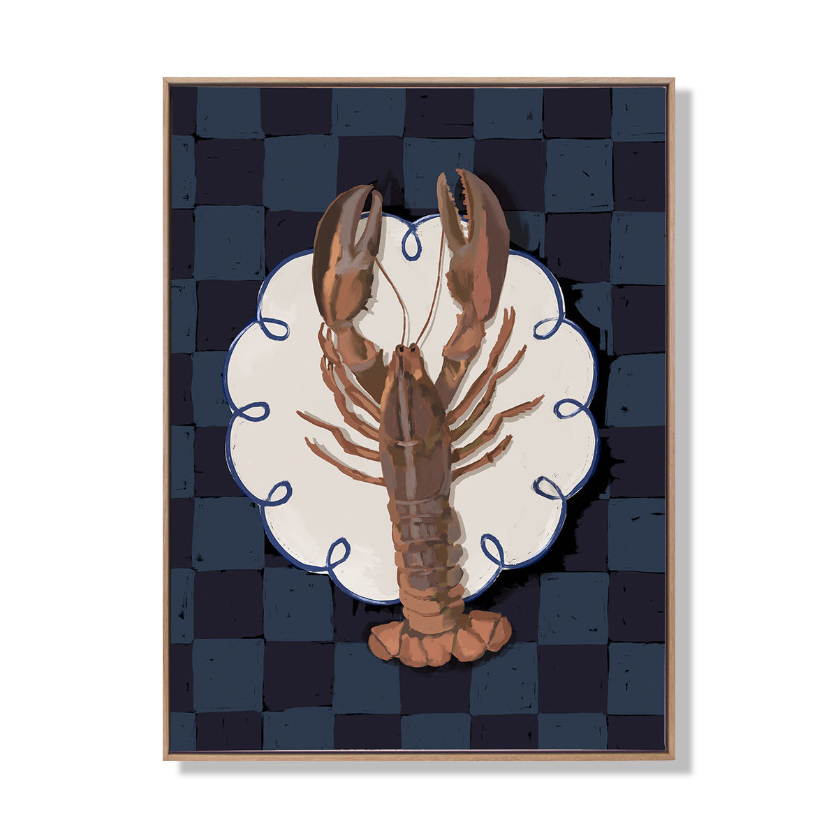 Freshwater Deep Blue Canvas Art Print - A captivating still life piece leaving this freshly caught freshwater crayfish front-and-centre, illuminated by a white decorative plate against a simple checkerboard tablecloth. Palette includes two shades of deep blue, with reddish-brown tones used for the crayfish.