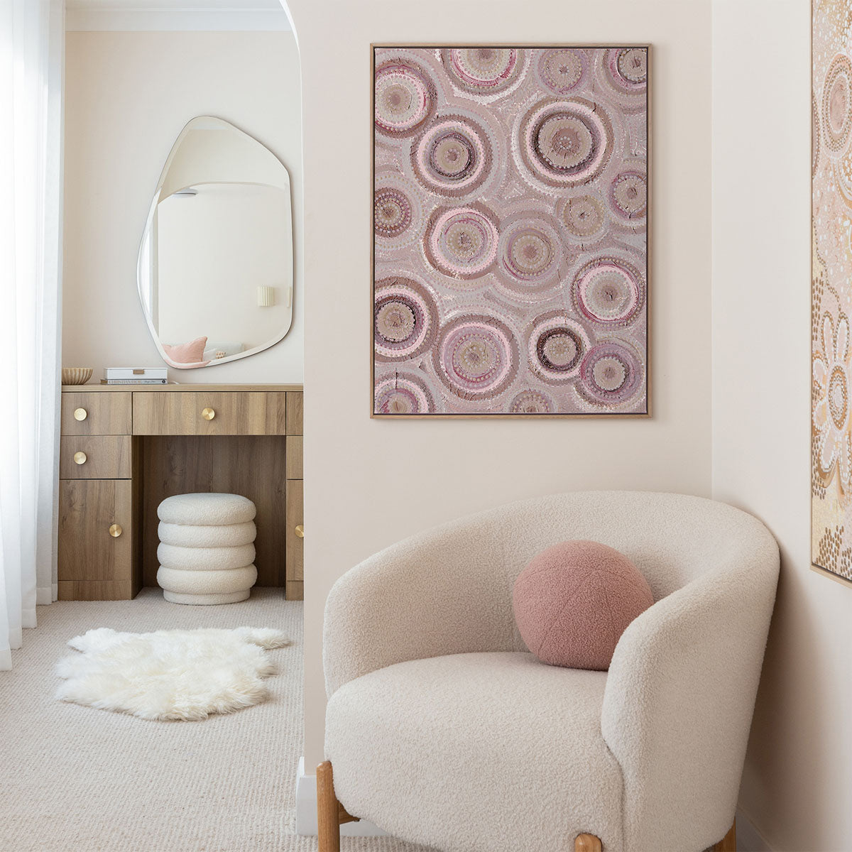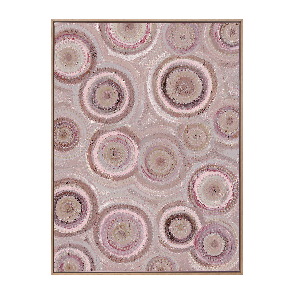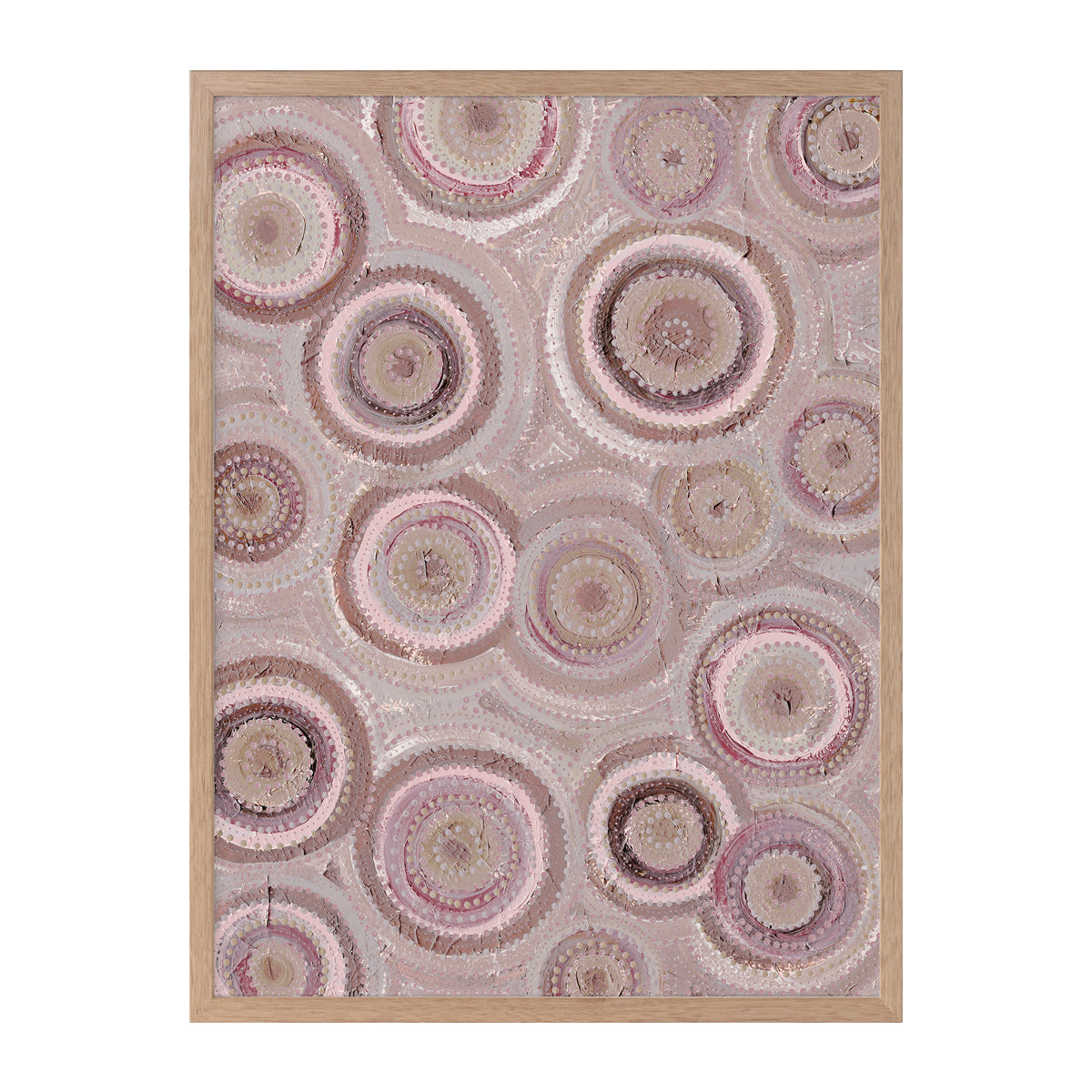 The Nirrangi II Portrait Art Print features a mesmerising array of circular patterns in soothing tones, creating a dynamic yet calming visual experience. The intricate dot work and layered textures evoke a sense of connection to the natural world, offering a serene atmosphere to any space. Ideal for both contemporary and traditional settings, this artwork adds depth and interest, making it a perfect choice for enhancing your homes aesthetic with a touch of elegance.