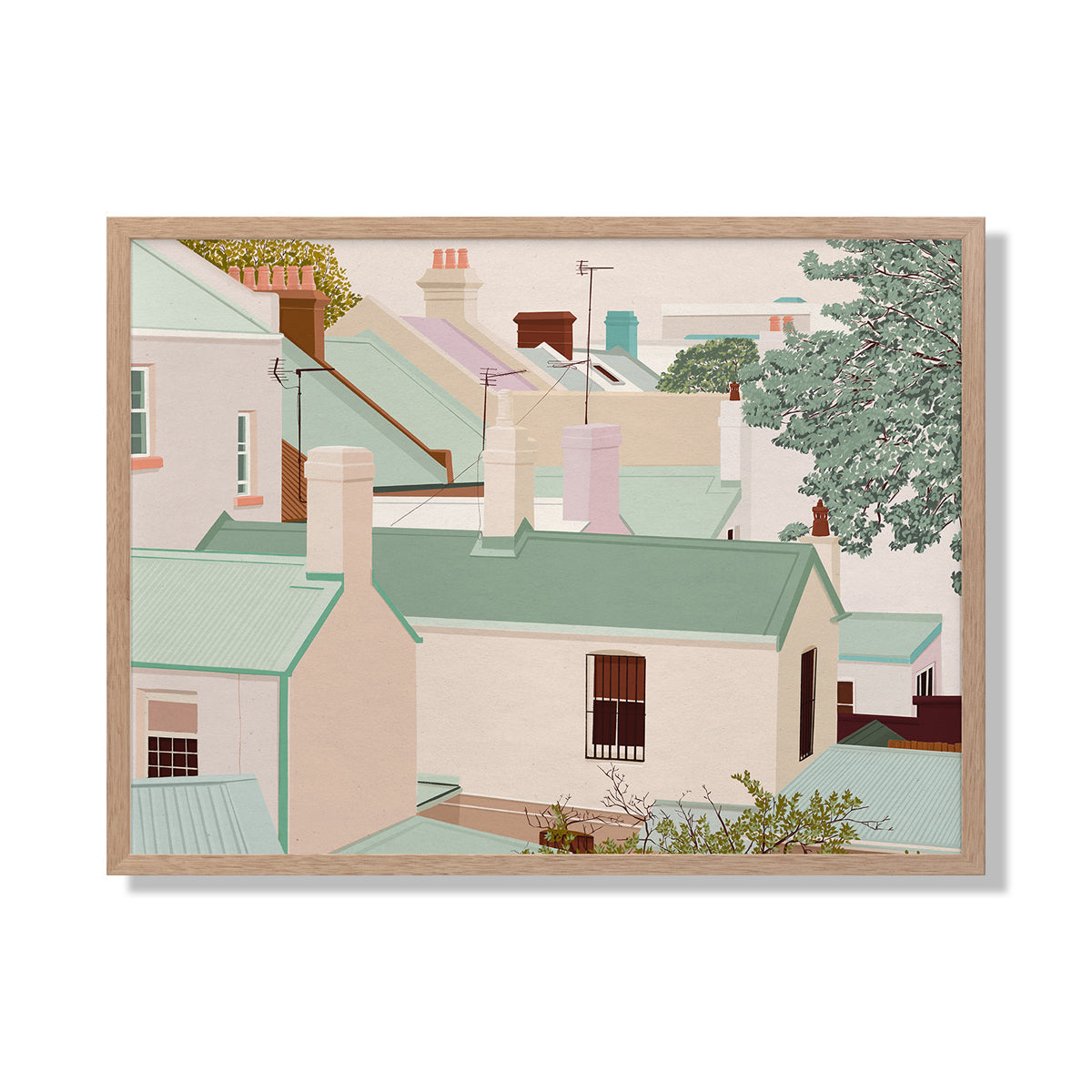 Paddington Canvas Art Print - A playful, archictectural illustration featuring rows of pastel green rooftops in a suburban Sydney landscape.
