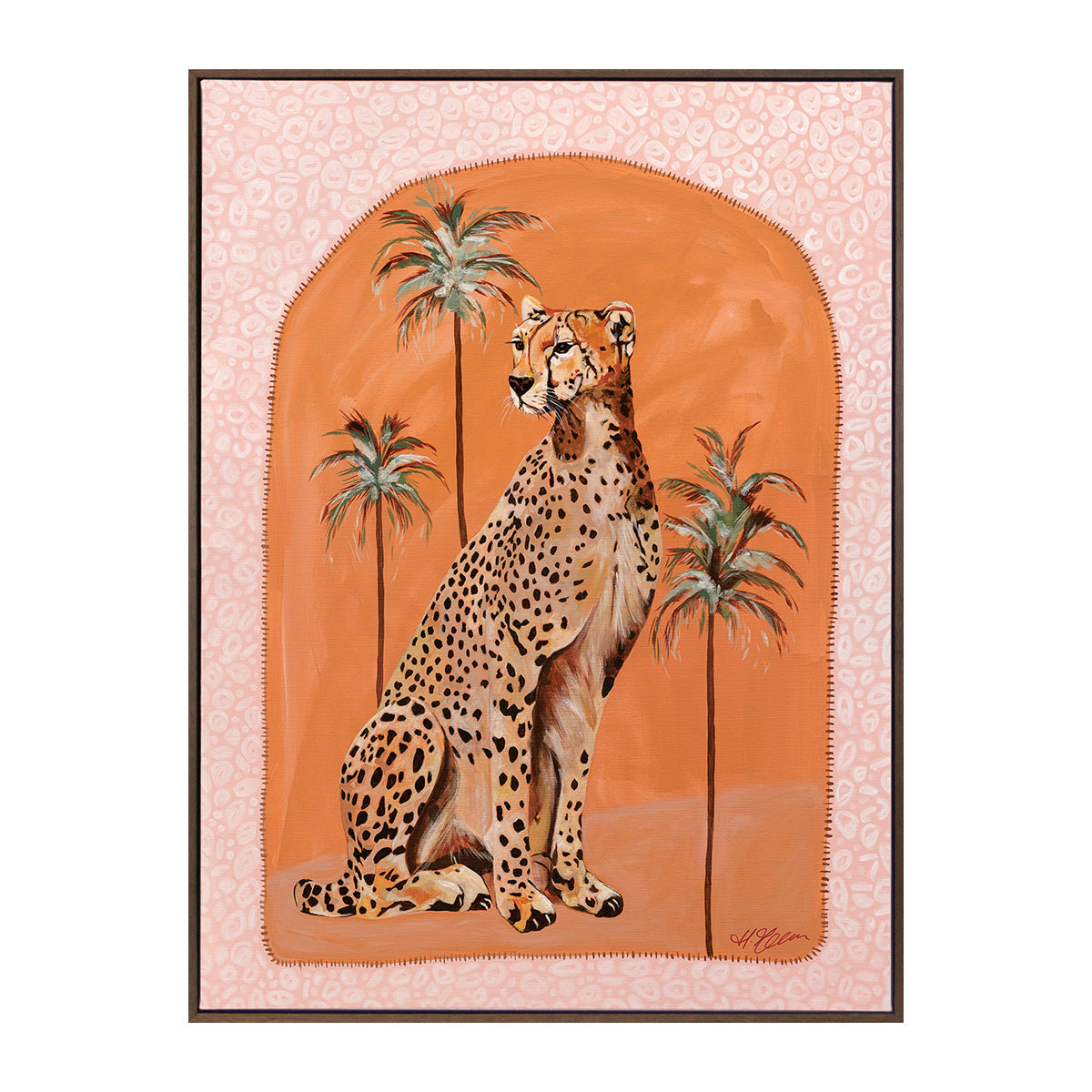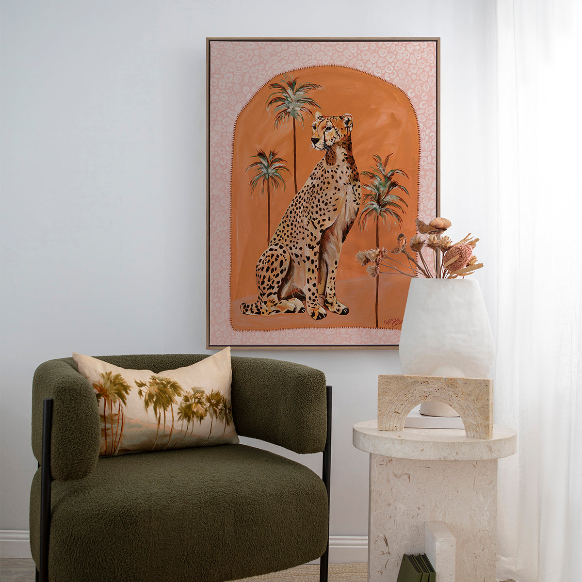 Fun and inviting, this boho-inspired Thinking Of You Art Print features a regal cheetah, enjoying a moment among the palm trees on a warm summers night. A bright palette of pink and orange tones, with some hints of green, complements funky shapes and patterns throughout the work. Urban Roads range of artworks are perfect to uplift your home, fill that empty wall, or add an extra layer of texture and comfort.