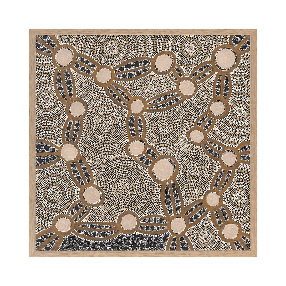 The Wanakiji Jukurrpa (Bush Tomato Dreaming) Brown Art Print is a magnetic work of Aboriginal art. This piece takes centre stage in your space with an adventurous design of connected circles atop a meticulous array of dots. This traditional Aboriginal piece features a neutral palette of light brown shades, beige and black, with an overall warm undertone. It showcases the remarkable talent and cultural heritage of a skilled local Aboriginal Artist, making it a true embodiment of Indigenous Artistic expression and storytelling.