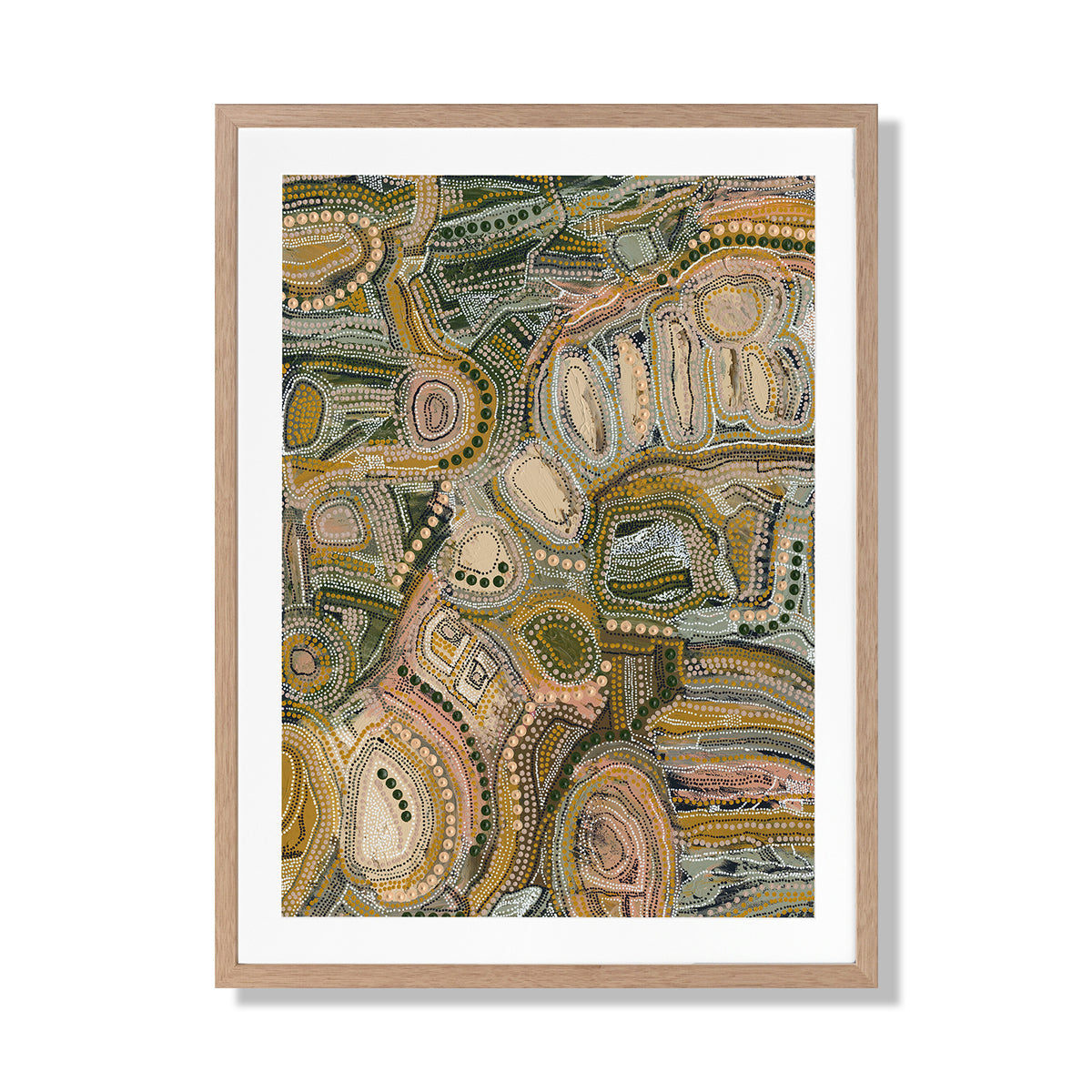 Wiraywinhangin Marramarra Art Print - Breathtakingly intricate, this contemporary Indigenous Aboriginal artwork piece by artist Amanda Hinkelmann highlights the importance of The Dreaming stories in the passing down of lessons and messages in Indigenous Aboriginal culture. Featuring myriads of paths, shapes and patterns, this captivating artwork shows its connection to Mother Earth by use of a warm, muted and earthy colour palette of moss green, beige, mustard and peach tones. This is the sister piece to Marramarra. Born on Wiradjuri Land in Wagga Wagga, Amanda is an exceptionally passionate and talented Aboriginal artist who has been creating breathtaking original artworks from her studio for many years now. Amanda's artworks share stories of resilience, strength, and the power of women.